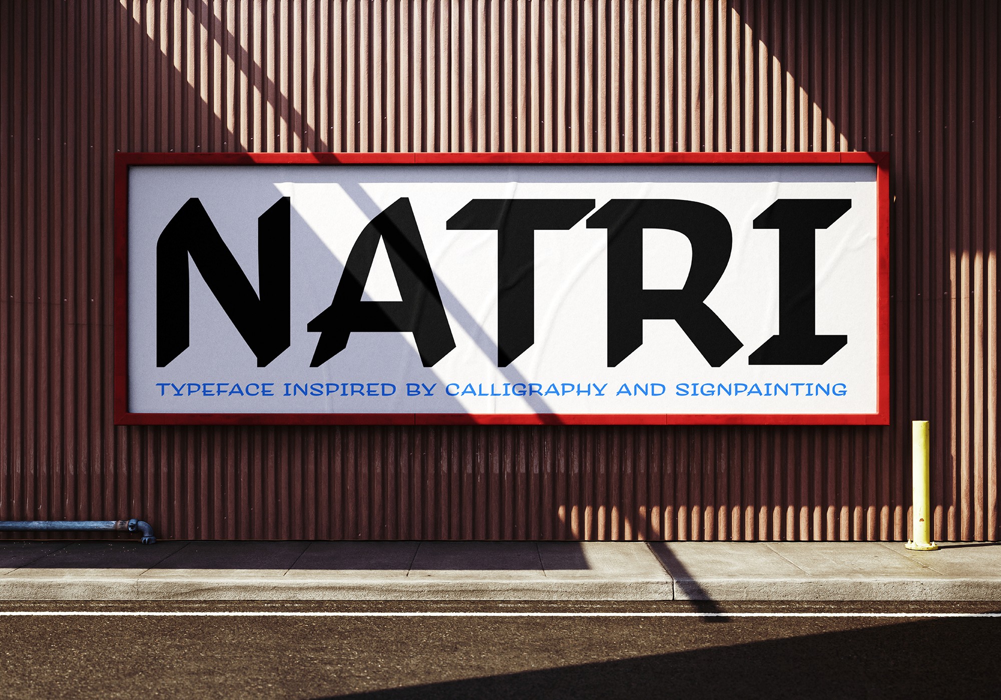 There are different methods of interpreting the handwriting. In the case of Natri, instead of forcing a handmade look, it takes advantage of computer digitization. The natural stroke endings of brush lettering are replaced with strict mechanic-geometric look. In certain letter combinations, letters look like architectural objects – buildings viewed from above.